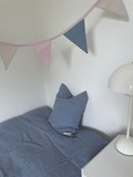 Dynen lukkes med bindebånd, og puden har kuvertlukning.