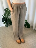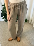 Lette og luftige hørbukser i en skøn taupe/brun farve, med elastik og bindebånd i taljen, samt 2 skrålommer og straight fit.