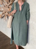 Smuk hørkjole med lommer, v-hals og 3/4 ærmer, i en skøn kaki grøn farve.