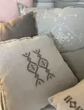 Hørfarvet pudebetræk med et smukt brunt broderi i hyggelig bohemestil. Pudebetrækket er rigtig flot at mixe med hørpuder i andre farver og mønstre.