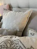 Hørfarvet pudebetræk med et smukt hvidt broderi i hyggelig bohemestil. Pudebetrækket er rigtig flot at mixe med hørpuder i andre farver og mønstre.