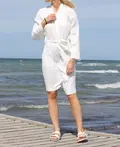 Skøn kimono i en flot mælkehvid farve, med to påsyede rummelige lommer og bindebånd ved taljen.