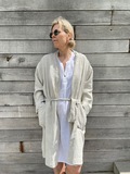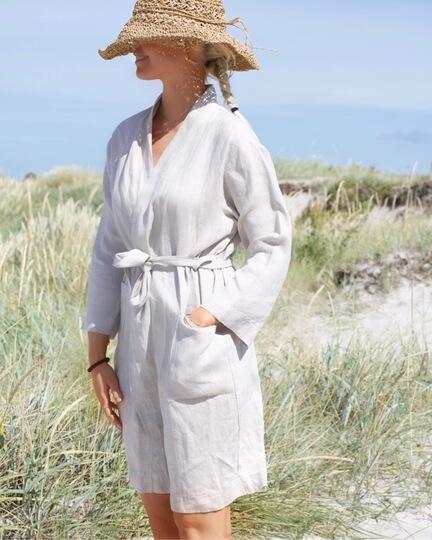Skøn kimono i en flot naturfarve, med to påsyede rummelige lommer og bindebånd ved taljen.