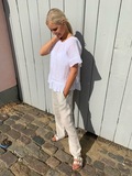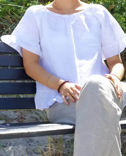 Let og elegant hvid bluse med flæser, og en smuk elastisk-rynkeeffekt ved halsåbningen.