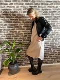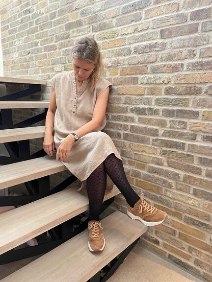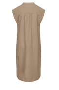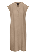 Skøn og let hørkjole, i en lys brun nuance, med V-formet halsåbning og stolpelukning med 3 brune knapper.