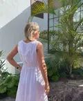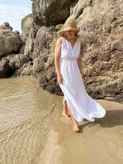 Sommerens smukkeste hvide maxi hørkjole har et feminint design, med de fineste dekorative detaljer med blonder i halsudskæringen, bredt elastik i taljen og slidser i begge sider. Perfekt til sommerens festligheder og kommende studentergilder.