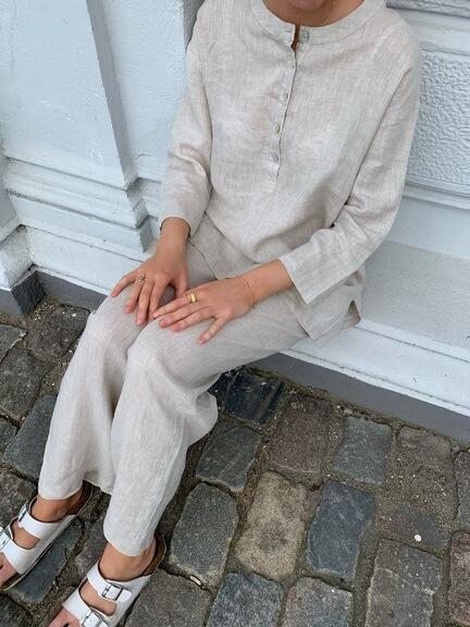 Let skjorte med lange ærmer, slidser i siderne og stolpelukning med 6 perlemorsknapper som fuldender det afslappede look.