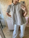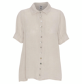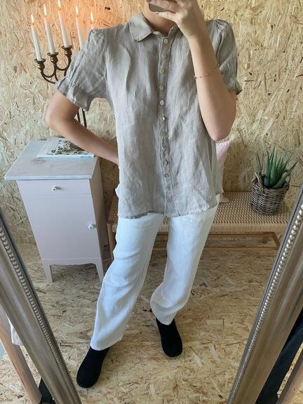 Sød kortærmet skjorte med perlemorsknapper og rynkebånd i ærmer og fin rynkekant på ryggen.